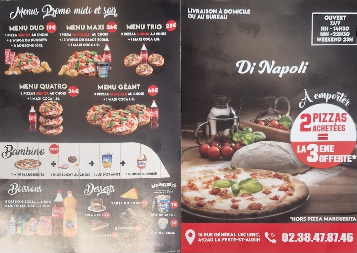 Welcome to the delightful world of Di Napoli - France, where pizza isn’t just a meal; it’s an experience. Nestled in the charming town of La Ferté-Saint-Aubin, at 16 Rue Général Leclerc, this pizza haven offers a culinary journey that celebrates freshness and flavor. With a phone line open for easy ordering at +33 2 38 47 87 46, getting your hands on their delectable pizzas has never been easier.